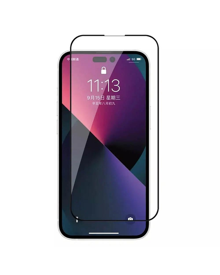 Lámina premium para iPhone 14 completa, con borde negro. Protege la pantalla de tu equipo de posibles caídas y golpes.